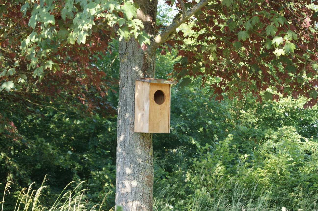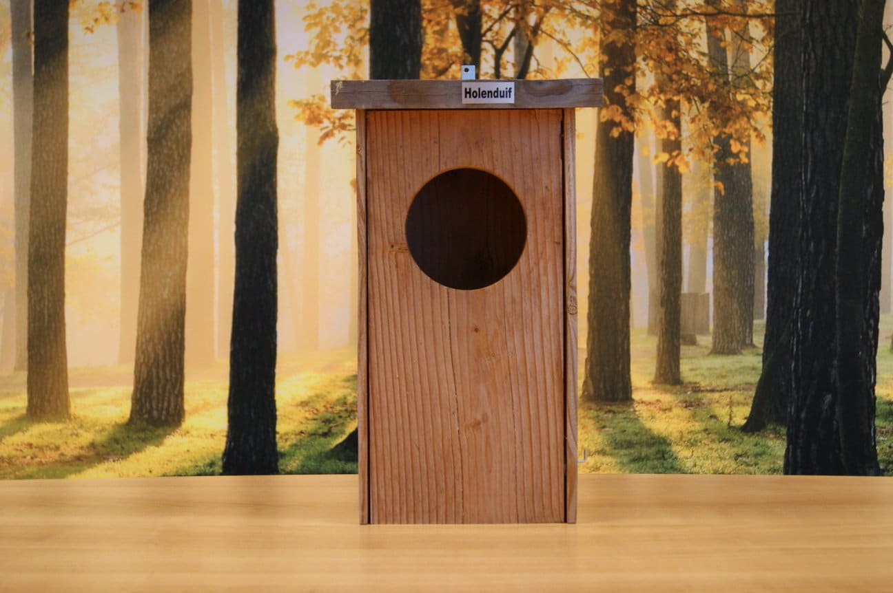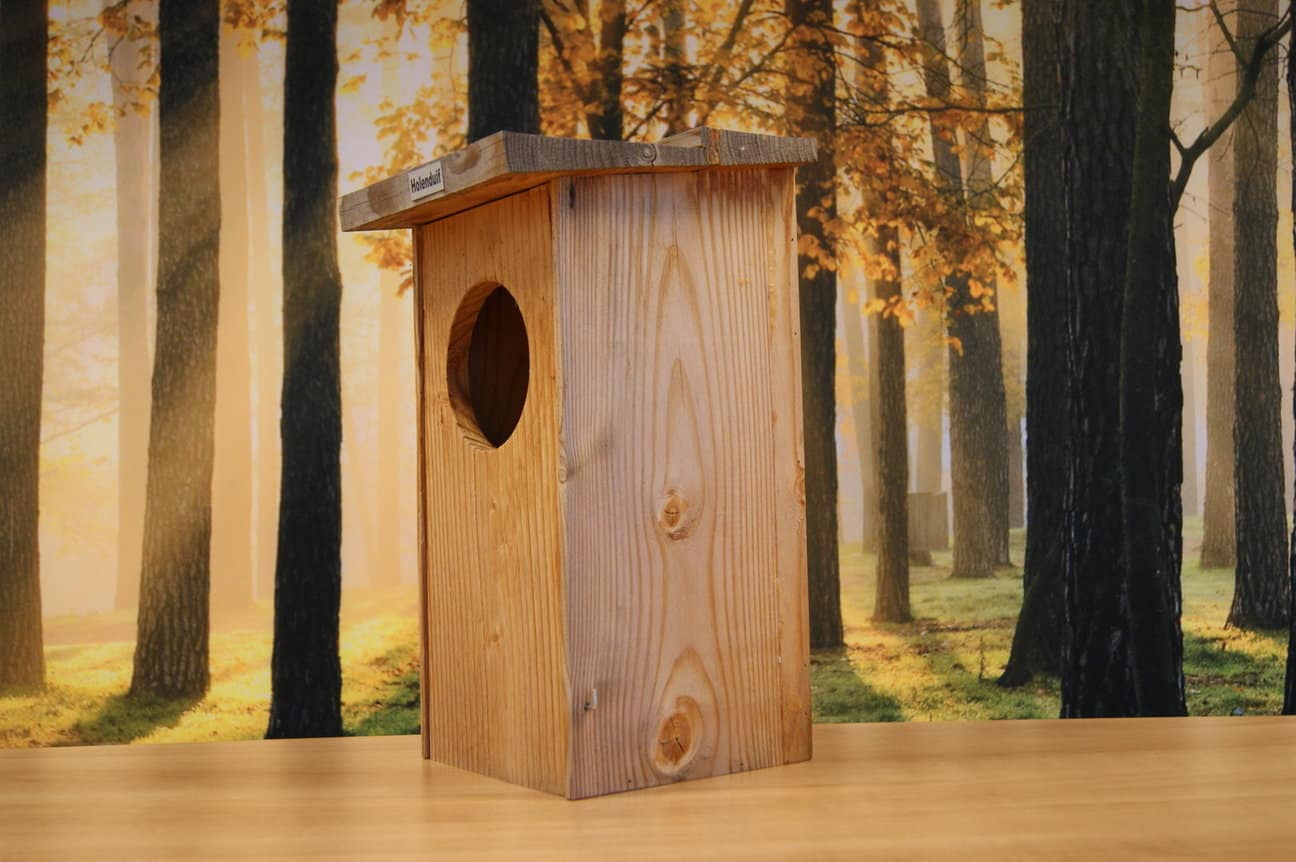 De nestkast is gemaakt van FSC gecertificeerd douglashout. De zijkanten bestaan uit geschaafd douglashout en het dak bestaat uit zweeds rabat douglashout. De constructie van het dak is zo ontworpen dat bij regenval het water er goed vanaf loopt. De nestkast is ook voorzien van een ophangstuk t.b.v. ophanging aan een boom of muur.