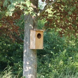 Wij raden aan om de nestkasten in de maand oktober schoon te maken, na het broedseizoen. De voorzijde van deze nestkast kan opengemaakt worden middels een duimschroef aan de zijkant.
