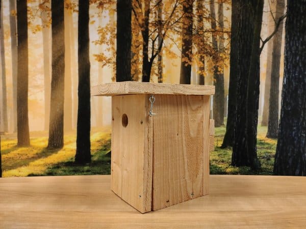 Wij raden aan om de nestkasten in de maand oktober schoon te maken, na het broedseizoen. De bovenzijde van deze nestkast kan opengemaakt worden door middel van een windhaakje.